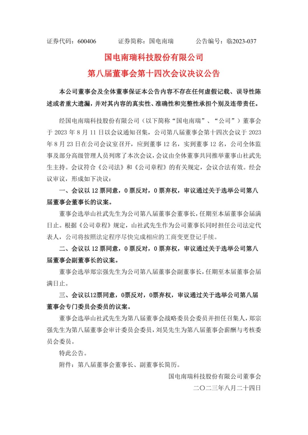 8月24日,国电南瑞发布公告称,经公司董事会于2023年8月11日以会议通知召集,公司第八届董事会第十四次会议于2023年8月23日在公司会议室召开。