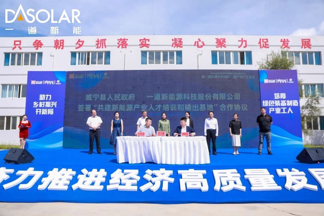 8月26日,威宁县人民政府与一道新能源科技股份有限公司在一道长通光伏组件二期生产线开工仪式上签订共建“新能源产业人才培训输出基地”合作协议。市人大常委会副主任程静,县委副书记、县长邓林,县人大常委会主任杨华忠,市人民政府副秘书长、市金融办主任袁薇,市投促局副局长胡媛,市工信局民营经济发展中心主任吴江涛,市发改委二级调研员石寿飞,县四家班子成员,贵州长通集团董事长张钊以及一道新能组件制造中心总经理马俊等领导出席开工仪式。