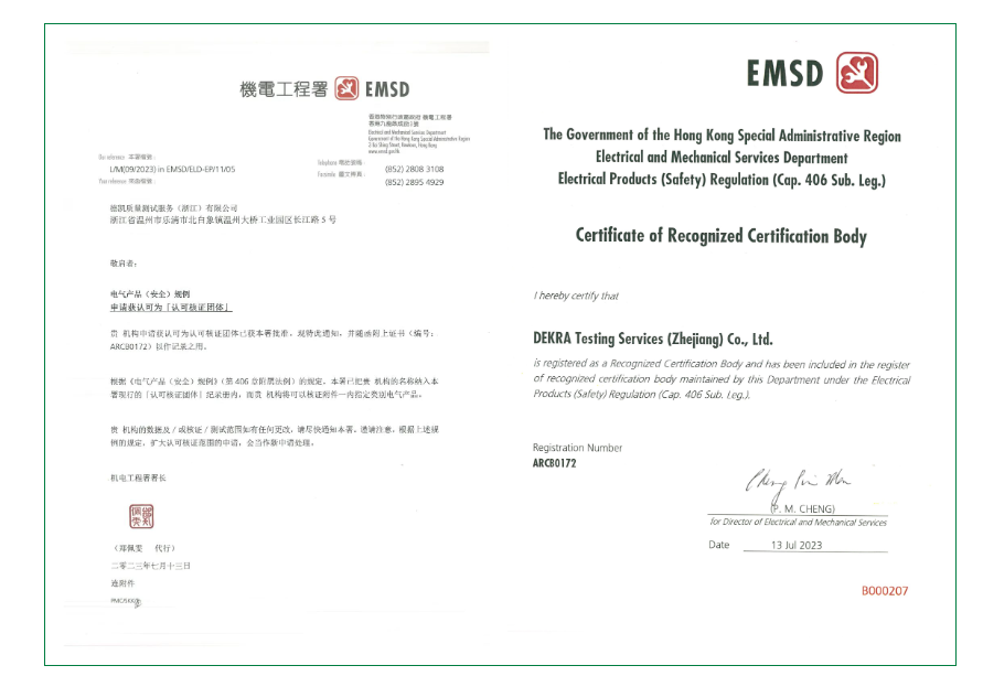 DEKRA德凯温州实验室成为香港机电工程署(Electrical and Mechanical Services Department,简称EMSD)认可核证团体,服务范围涵盖电器产品,类别包括:装置附件及连接器件、装置保护设备、电工电子产品、固体绝缘材料。