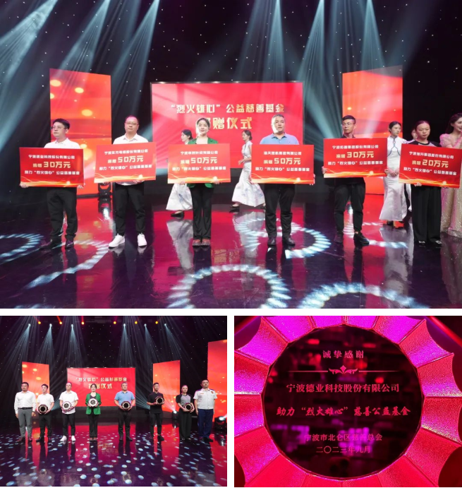 北仑区慈善总会联合区消防救援大队设立了“烈火雄心”公益慈善基金,来自区内的数家爱心企业共计捐款230万元,德业股份作为其中一员为本次“烈火雄心”公益慈善基金捐赠了30万元,让消防员们感受到了来自社会各界的关爱,消除了他们的后顾之忧。