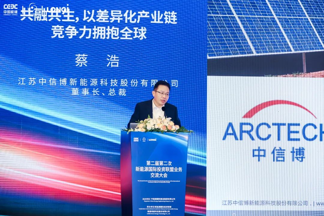 会上,蔡浩作了题为《共融共生,以差异化产业链竞争力拥抱全球》的演讲,他深刻阐述了跟踪支架的价值及全球光伏市场发展前景,并就中信博的创新理念和全球战略做了讲解。