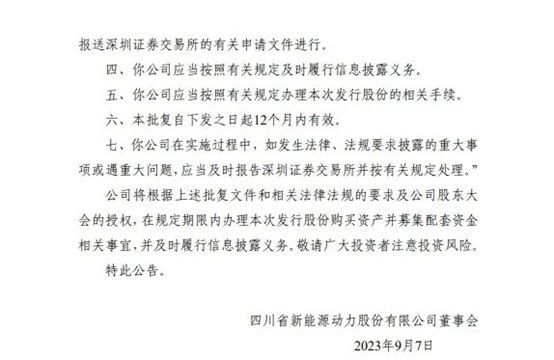 9月6日,四川省新能源动力股份有限公司(简称“川能动力”,SZ:000155)发布了《关于同意四川省新能源动力股份有限公司发行股份购买资产并募集配套资金注册的批复》公告。