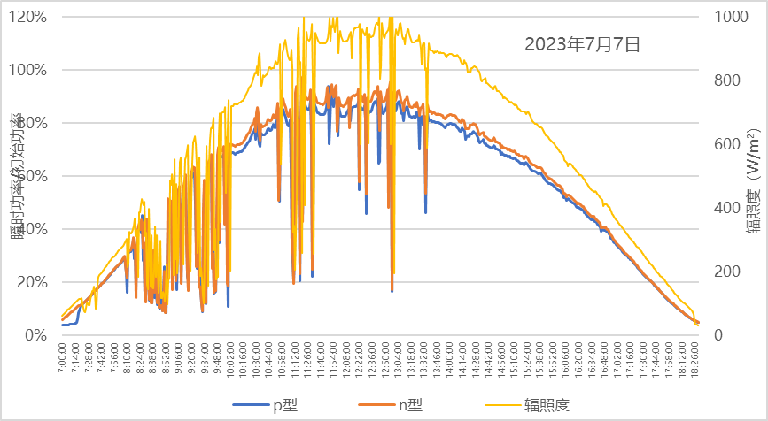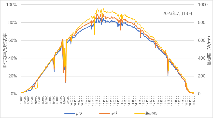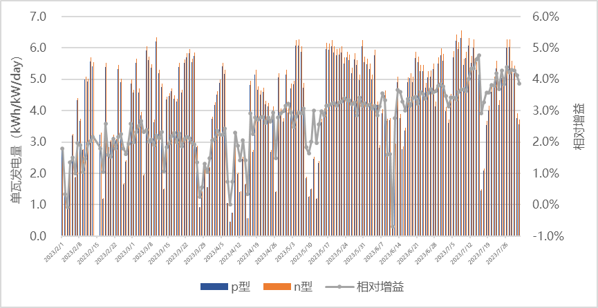 在双面发电性能方面,n型组件双面率为80%左右,p型组件双面率为70%左右,假定组件背面辐照强度100-150W/m2,那么10%双面率差异带来的n型组件发电量增益在1%-1.5%之间,当在不同的地面环境下(反射率在20%-30%时),结合不同的阵列高度、前后排间距、背面有无遮挡安装等条件, n型组件发电量增益在0.8%-1.2%之间。