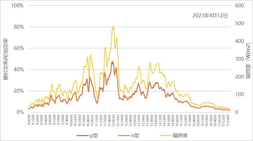 在低辐照发电性能方面,从机理上讲,与少子寿命、开路电压、并联电阻密切相关,由于Bycium+电池具备更为优异的内阻设计,更高的少子寿命和开路电压,所以电池的低辐照发电能更为优异。在辐照度600W/m2或以下时,如清晨或傍晚条件下,经测算,n型组件弱光发电综合增益为0.2%左右。