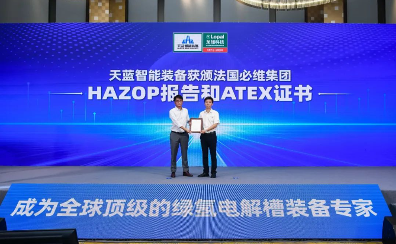 该电解槽目前已取得法国必维国际检验集团HAZOP分析和安全仪表系统SIL评估认证、欧盟ATEX防爆认证;这意味着“天蓝1号”首台套电解槽设备的各项安全性能指标已经达到了世界领先水平。