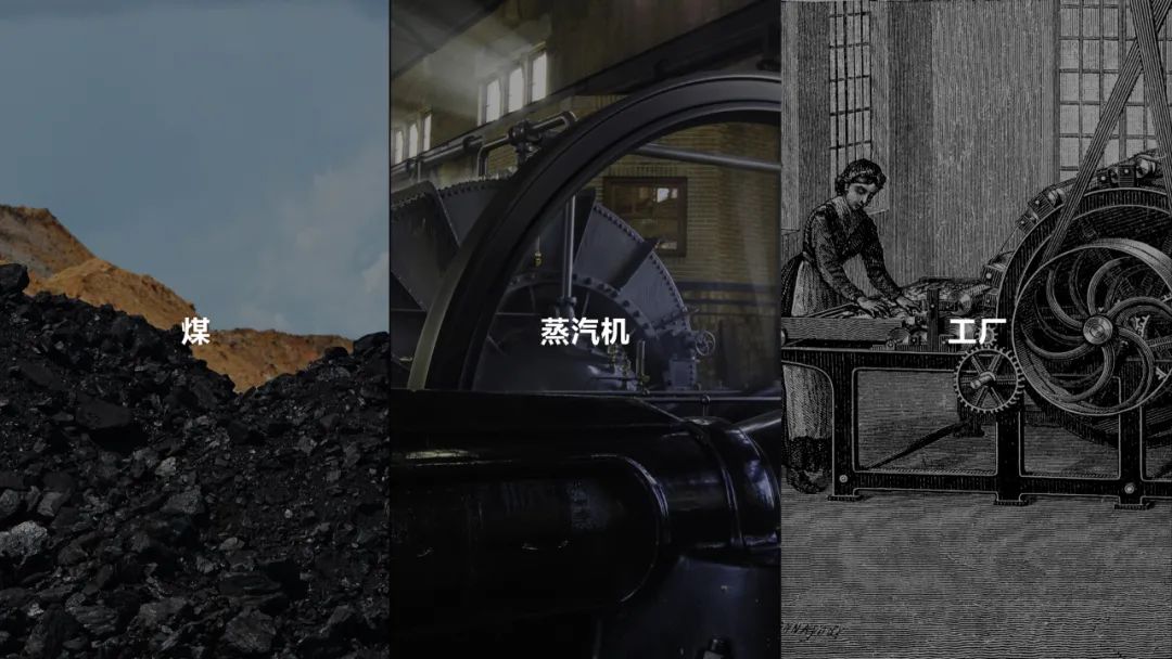 在煤炭能量层层转换中,蒸汽机,纺纱机,纺织产业,国际贸易,蒸汽船,蒸汽火车,铁路,钢铁,这些产业层层推进,形成了新工业体系。