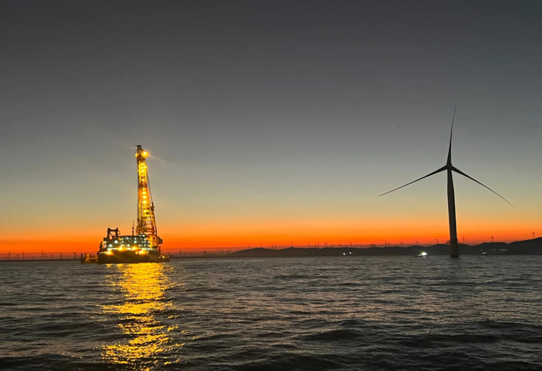 项目2021年9月首台机组吊装成功;2021年12月首台机组成功并网发电;2022年12月超额完成大唐公司年度建设任务目标;2023年6月全部机组并网发电。一个个节点的完成,是项目团队精细策划、团结协作,克服海域地形复杂、风机场址风大涌高、船机设备资源紧张等不利条件的结果。他们充分利用窗口期,扎实推进项目建设投产,仅用不到三个月的时间,实现了从首台风机吊装到并网发电。