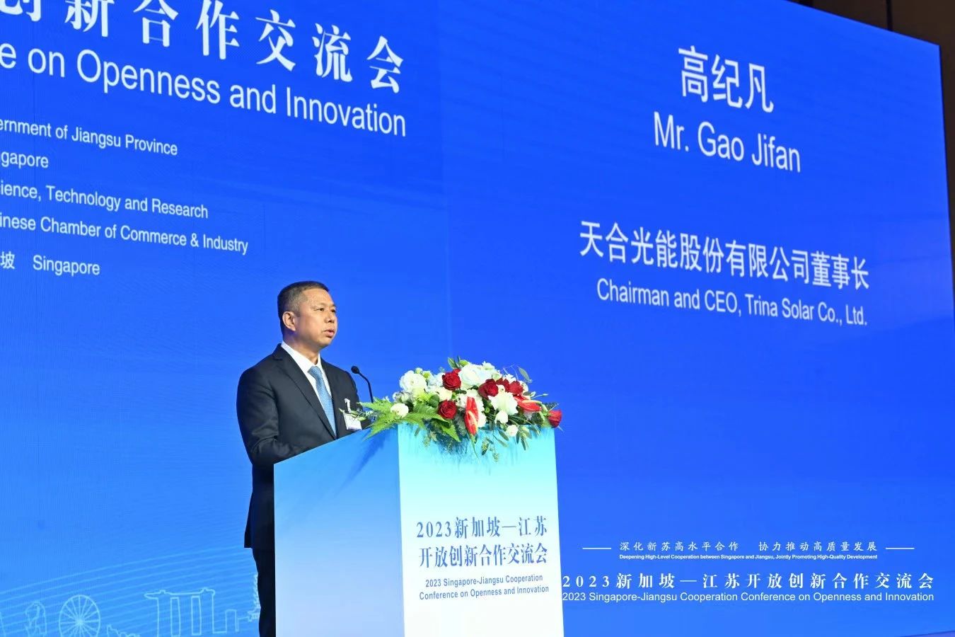 高纪凡受邀与会发言,10年前,天合光能在中新合作的重要契机下,在新加坡成立了亚太中心,业务覆盖新加坡、泰国、马来西亚等具有潜力的太阳能新兴市场。今年,中新关系提升为全方位高质量的前瞻性伙伴关系,开启“高质量”合作新时代,得益于中新两国“高质量”合作伙伴关系,得益于江苏省政府对企业“走出去”的支持,得益于新加坡良好的投资产业环境,如今,天合光能在新加坡的发展日新月异,在销售业务、研发创新、人才规模、金融授信等多领域都实现了大幅增长。我们充分发挥新加坡连接东西方经贸与文化的纽带作用,借助天合光能在新加坡国际商务中心的定位,助推天合光能国际化发展,增强全球竞争力。