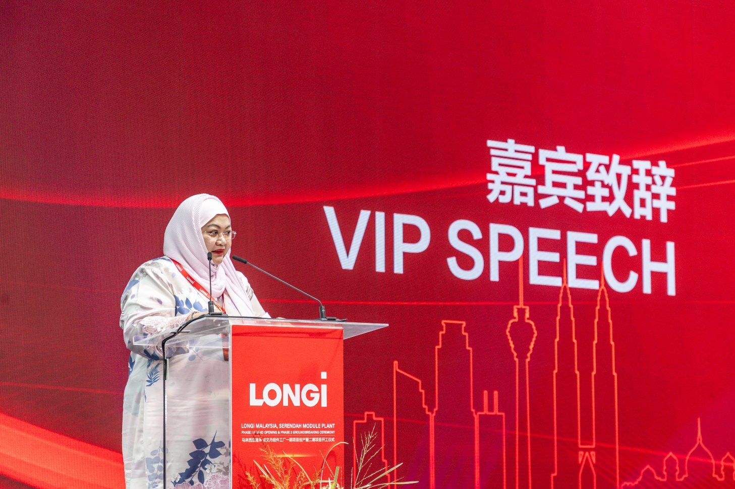 马来西亚国际贸易及工业部代表拿督峇哈丽雅女士在投产仪式上表示,马来西亚的可持续发展愿景一直都是坚定的。“我们希望马来西亚成为全球贸易和工业的主要纽带。我们希望打造一个支持创新、优先考虑可持续增长、崇尚科技实力的营商环境。今天,随着隆基绿能马来西亚双文丹组件工厂的落成,我们见证了双方在实现可持续发展愿景方面的合作进展。放眼未来,全球光伏市场将呈指数级增长,预计年增长率将达到29%。如今,马来西亚站在绿色复兴的最前沿,这是一件非常值得骄傲的事情。”峇哈丽雅说。