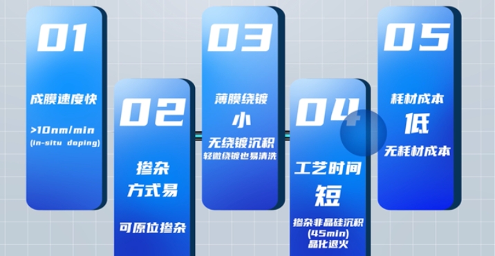 其中SE激光掺杂工序中,弘元采用高效选择性发射极(Selective Emitter)技术,在金属栅线与硅片接触部位及其附近进行高浓度掺杂,在电极以外的区域进行低浓度掺杂,以降低扩散层的复合,优化发射极,提升电池的转化效率。PE-poly工序中,弘元TOPCon电池采用PECVD poly沉积技术,PECVD全称为等离子体增强化学气相沉积法(Plasma Enhanced Chemical Vapor Deposition),该技术路线可集氧化层制备、多晶硅层制备、磷原位掺杂三道工序于同一设备,具备成膜速率高,耗材成本低、制程工艺步骤少等综合优势。