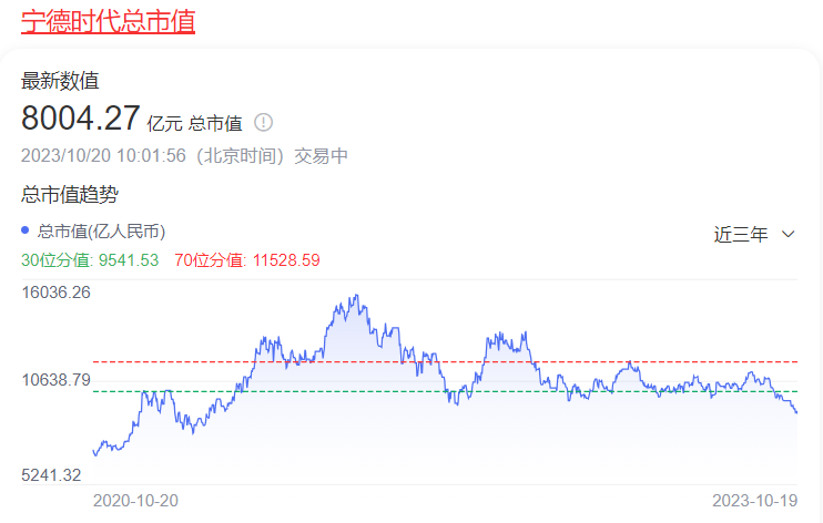 今年国庆过后,碳酸锂电池级碳酸锂价格直线下跌,10月10日报价17.85万元/吨,创年内新低。与碳酸锂价格一同跌去的,还有宁德时代的市值,目前,宁德时代市值面临8000亿元关卡,与顶峰超万亿已跌去近20%。
