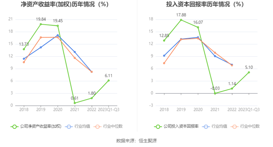 数据显示,2023年前三季度公司加权平均净资产收益率为6.11%,较上年同期增长6.62个百分点;公司2023年前三季度投入资本回报率为5.10%,较上年同期增长6.00个百分点。