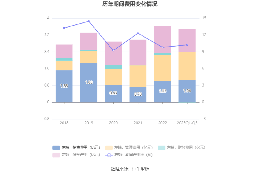 2023年前三季度,公司期间费用为3.48亿元,较上年同期增加9955.57万元;但期间费用率为10.27%,较上年同期下降0.74个百分点。其中,销售费用同比增长47.55%,管理费用同比增长47.85%,研发费用同比增长21.56%,财务费用由去年同期的-367.25万元变为-88.24万元。
