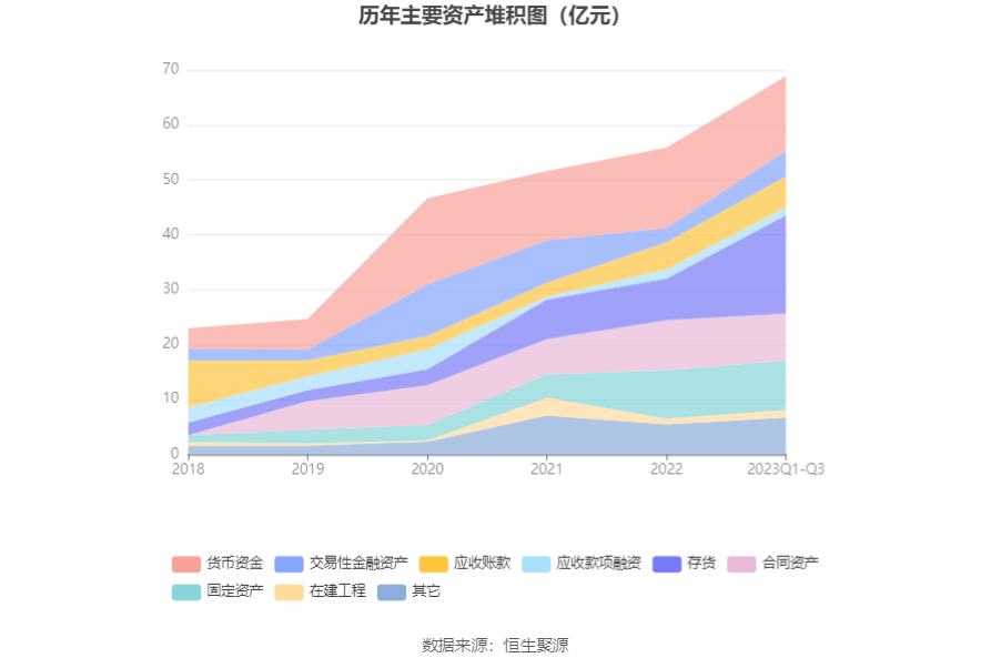 资产重大变化方面,截至2023年三季度末,公司存货较上年末增加135.81%,占公司总资产比重上升12.38个百分点;货币资金较上年末减少7.15%,占公司总资产比重下降6.46个百分点;合同资产较上年末减少6.99%,占公司总资产比重下降4.02个百分点;固定资产较上年末增加3.79%,占公司总资产比重下降2.47个百分点。