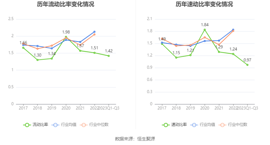 2023年前三季度,公司流动比率为1.42,速动比率为0.97。