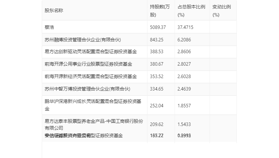 三季报显示,2023年三季度末公司十大流通股东中,新进股东为蔡浩、苏州融博投资管理合伙企业(有限合伙)、苏州中智万博投资管理合伙企业(有限合伙)、中信保诚新兴产业混合型证券投资基金,取代了上半年末的香港中央结算有限公司、易方达基金-中国人寿保险股份有限公司-分红险-易方达基金国寿股份均衡股票型组合单一资产管理计划(可供出售)、易方达瑞程灵活配置混合型证券投资基金、全国社保基金六零一组合。在具体持股比例上,前海开源公用事业行业股票型证券投资基金、前海开源新经济灵活配置混合型证券投资基金、鹏华沪深港新兴成长灵活配置混合型证券投资基金、易方达泰丰股票型养老金产品-中国工商银行股份有限公司持股有所上升,易方达创新驱动灵活配置混合型证券投资基金持股有所下降。