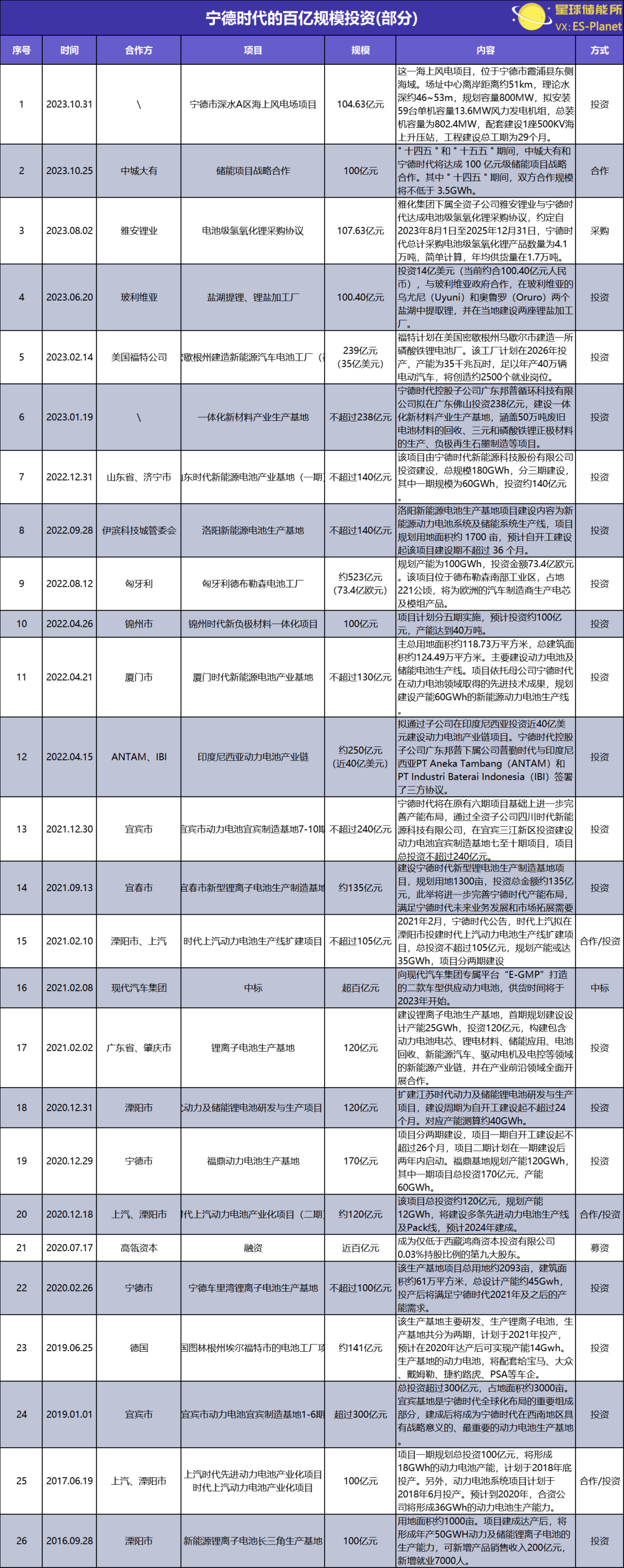 对此,星球储能所据公开信息进行的不完全统计显示,除去订单,宁德时代近几年共有26项超百亿规模的投资和合作,涉及金额共计超过4123.6亿元人民币,合作方包括现代汽车集团、雅安锂业等企业,也有高瓴资本等投资方以及各地政府部门。