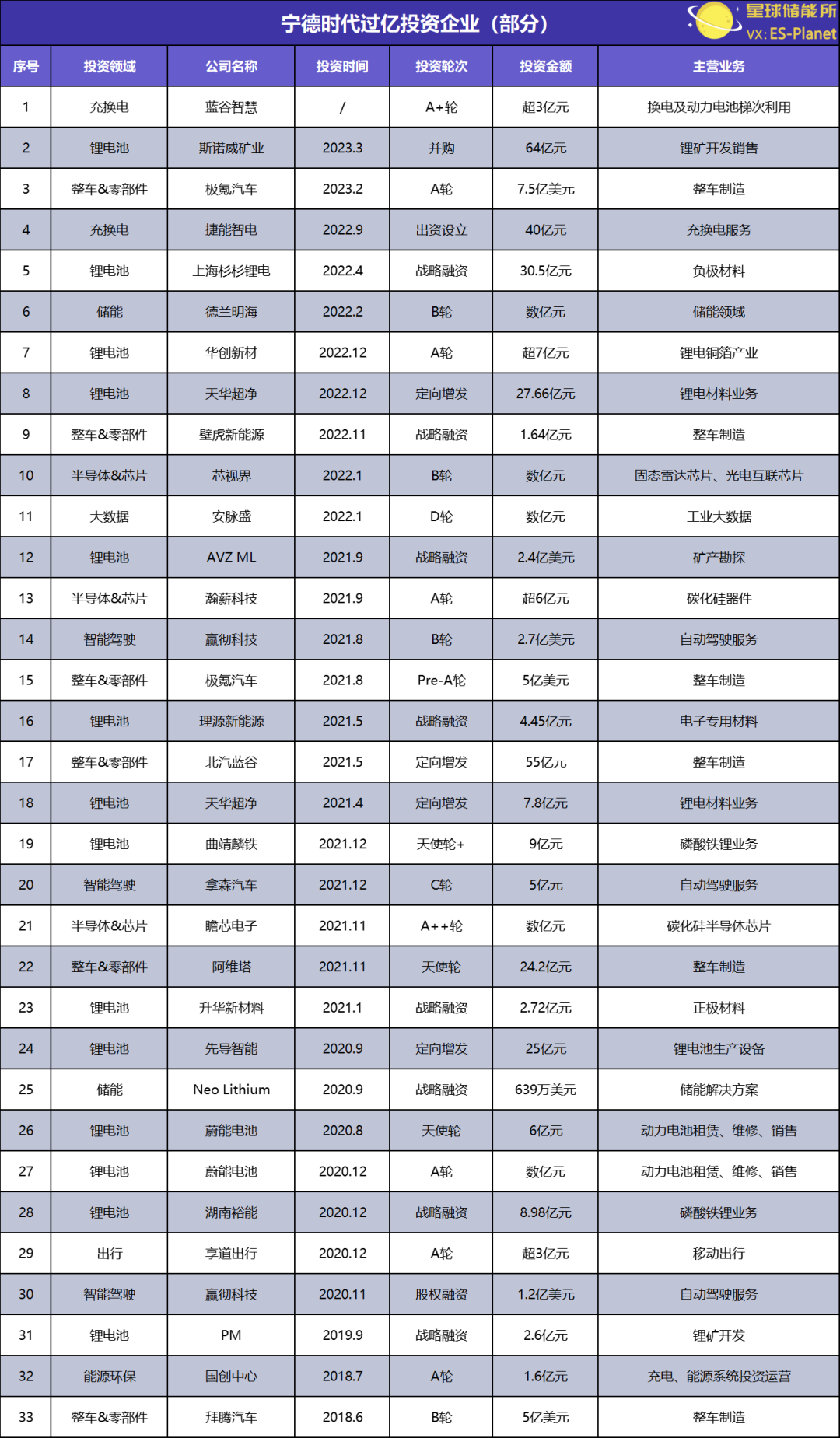 目前宁德时代朋友圈范围已经辐射到锂电、风电、储能、汽车、半导体、芯片、充换电、智能驾驶、工程制造等多个行业。