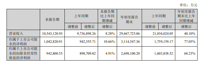 第三季度,宁德时代营业收入为1054.31亿元,同比增长8.28%,环比增长5.21%;归母净利润为104.28亿元,同比增长10.66%,环比下滑4.28%。