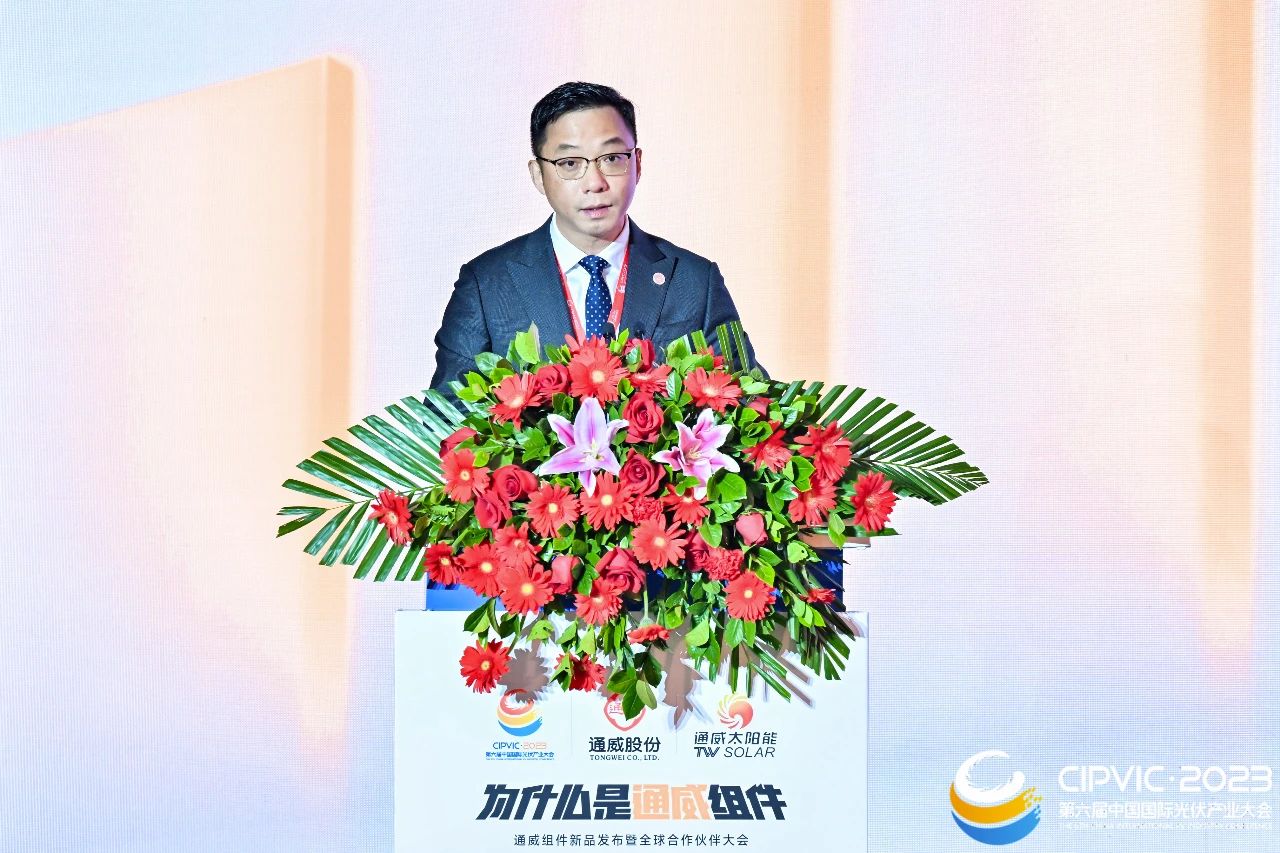 通威股份光伏商务部组件全球营销总经理邱新在致辞中首先对莅临现场的领导嘉宾致以衷心的感谢,并表示,今年是通威入局组件的第一个自然年,这一年的发展离不开广大伙伴的支持,也离不开这个沉淀定力的时代。时代为何选择通威?选择通威就是选择高效、选择诚信和选择可靠。高效、诚信、可靠架起了合作交流的桥梁,也为共同建设绿色能源的未来、共同奔赴更美好的生活的提供了更多的选择路径。真诚期待与广大行业同仁继续携手同行,共谋合作新篇,共绘兴业愿景。
