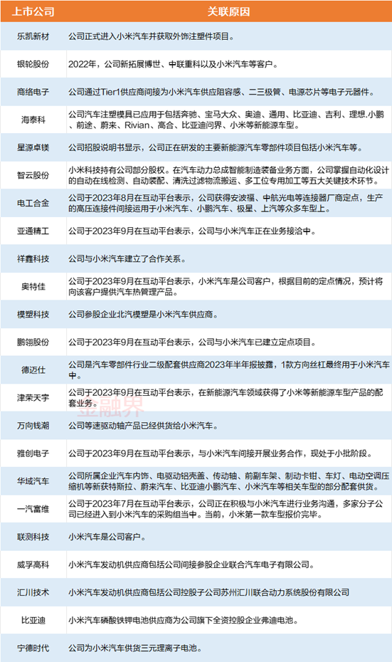 上海证券研报显示,A股已有奥特佳(热管理)、万向钱潮(等速驱动轴)、德迈仕(方向丝杠)、凯众股份(减震)、鹏翎股份、模塑科技、一汽富维等多家公司透露与小米汽车的合作动向。