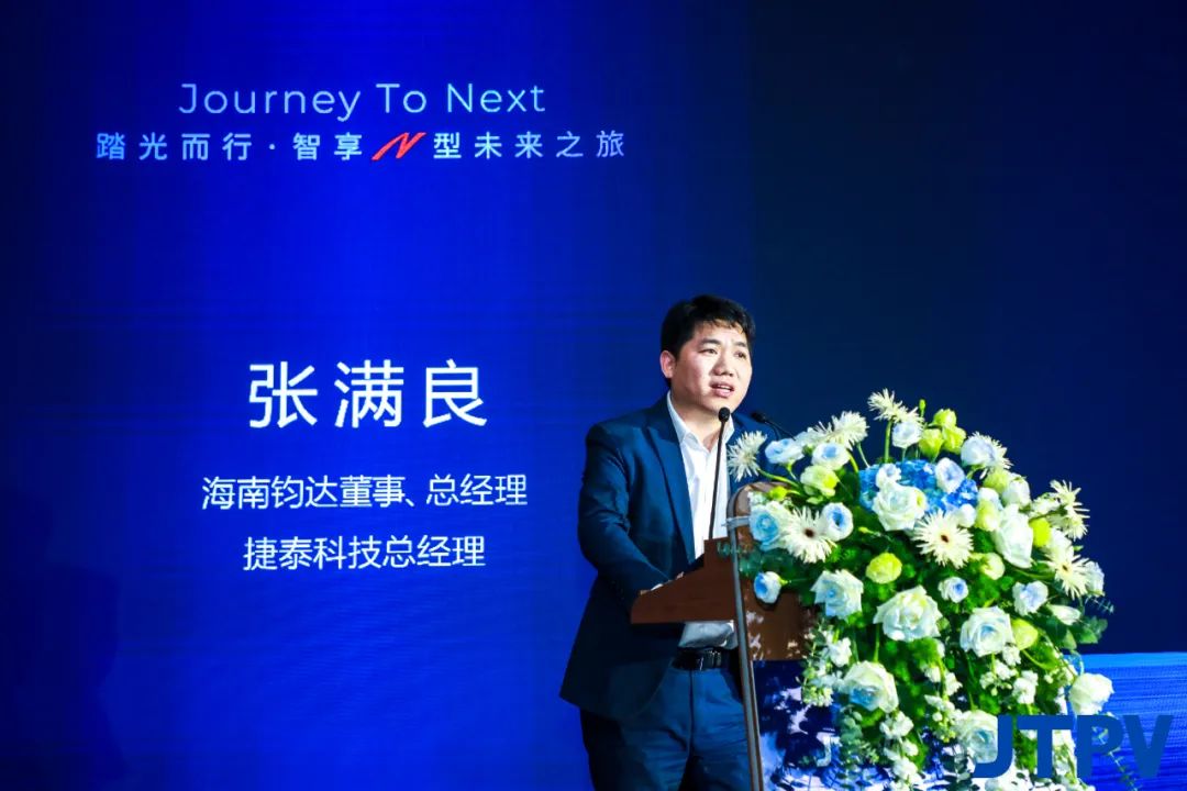 会议伊始,海南钧达董事、总经理;捷泰科技总经理张满良在致辞中对各位领导和嘉宾的到来表示了由衷的感谢和热烈的欢迎。张满良总裁表示,作为“N型电池领跑者”,捷泰科技始终以科技创新为引领,致力于推动光伏行业高质量发展。通过率先布局和砥砺深耕,目前N型TOPCon电池已全面进入大规模量产阶段,效率、良率行业领先。在N型时代,捷泰科技追求卓越,火力全开,展现出强大的市场竞争力。