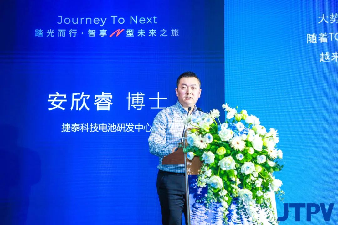 发布会现场,在与会嘉宾的共同见证下,《捷泰科技新一代N型TOPCon产品白皮书》正式发布。捷泰科技电池研发中心负责人宋怡潇从行业发展趋势、未来技术展望以及捷泰品牌三个层面对白皮书进行了深入解读。