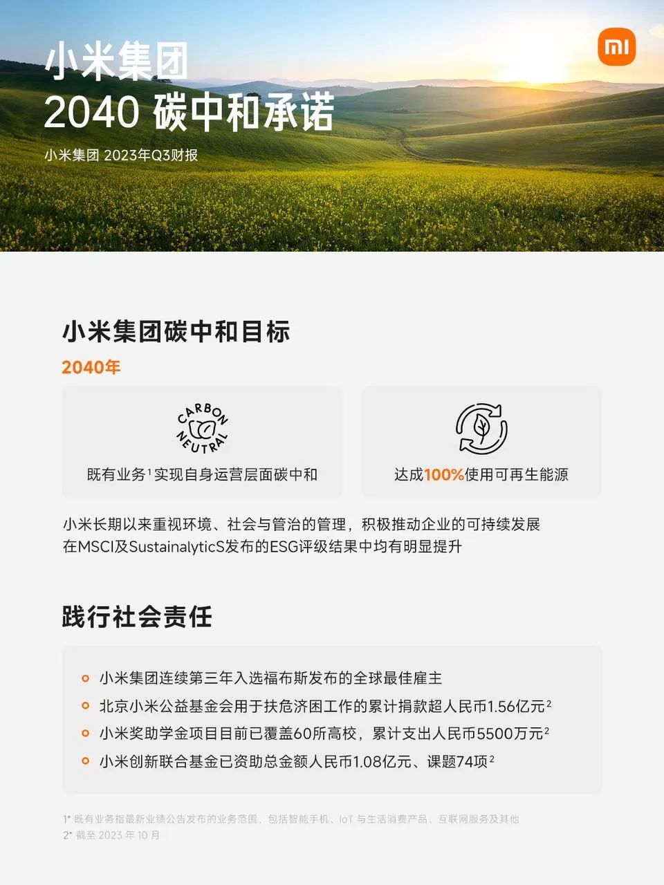 我们高度重视环境、社会与管治的管理,积极推动企业可持续发展。我们已经将ESG管理全面融入小米业务运营和管理中,作为公司发展策略的一部分。小米承诺,到2040年既有业务实现自身运营层面碳中和,并达成100%使用可再生能源。我们将在2023年底发布《碳中和行动报告》,详述集团碳中和行动计划。