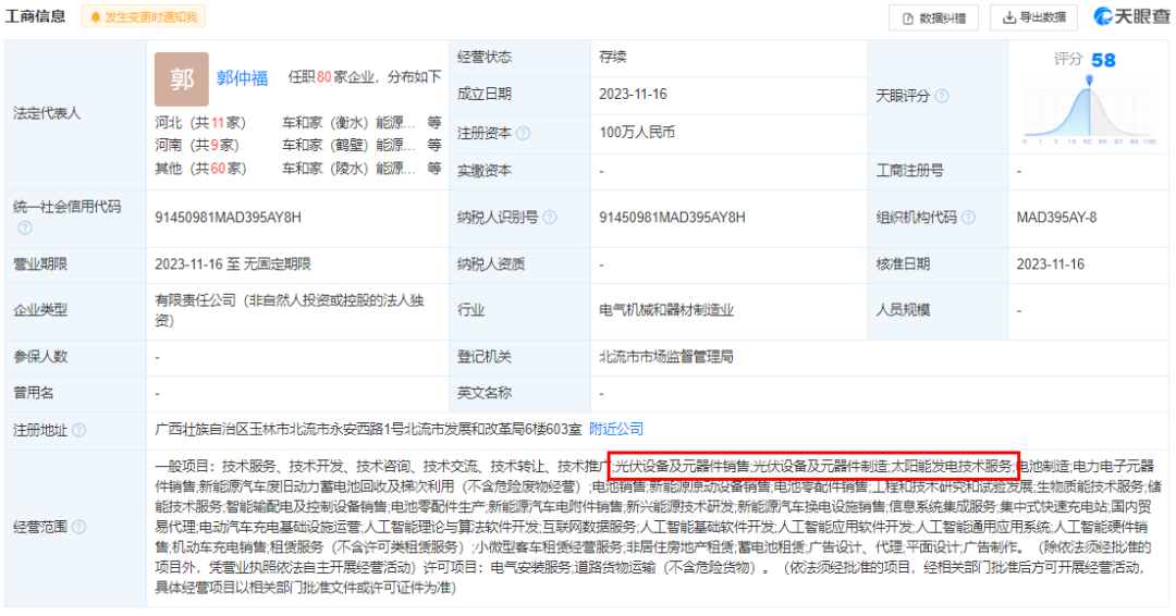 11月16日,玉林车和家能源科技有限公司成立,法定代表人为郭仲福,注册资本100万人民币,经营范围含光伏设备及元器件制造、电池销售、新能源原动设备销售、新能源汽车电附件销售、新兴能源技术研发、人工智能基础软件开发、人工智能应用软件开发等。