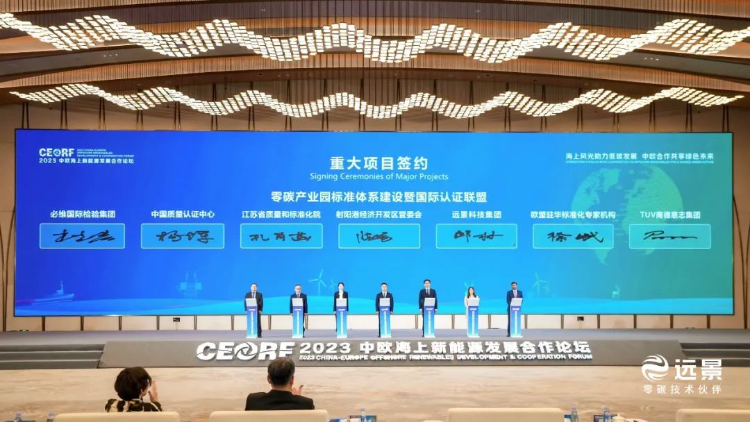 与此同时,作为论坛现场签约的25个重大项目之一,远景能源与射阳县人民政府就低(零)碳产业园创新示范区合作共建项目签署合作协议,为进一步推动海上新能源技术创新与产业升级、深化中欧务实合作注入新动能。该项目将建成以新型能源系统、产业生态系统、智慧物联系统为核心的零碳产业园创新体系,成立绿电及碳资产运营平台公司,加快零碳产业园智能物联网数字化平台建设,打造绿色新工业体系。