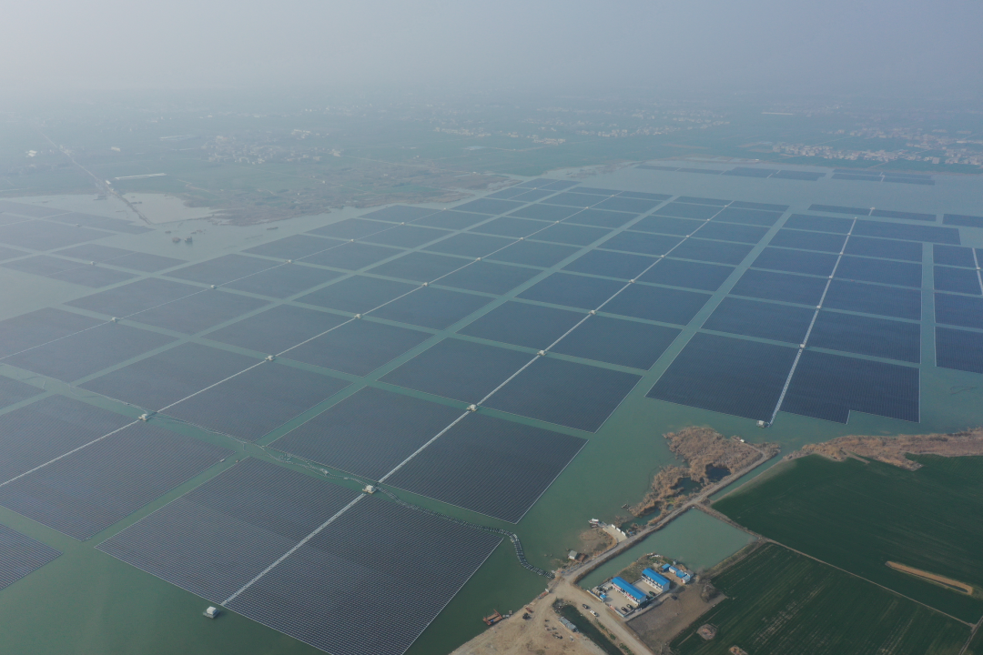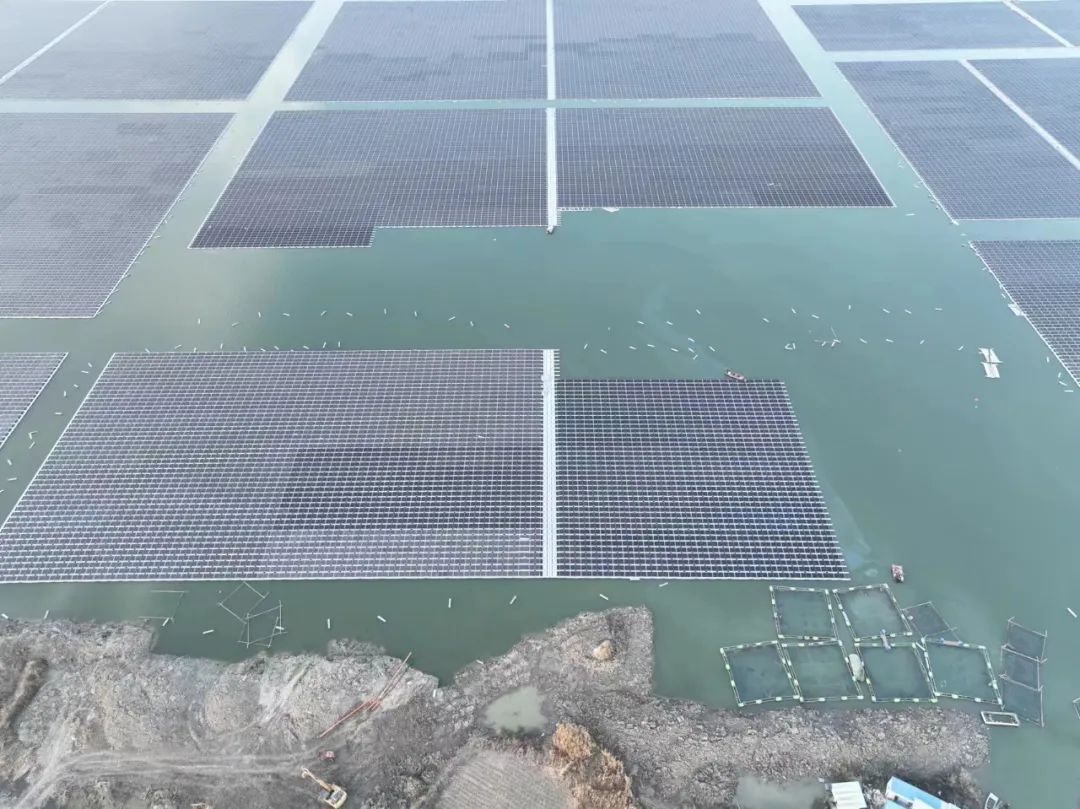 作为国家能源局批复的第一批大型风光电基地项目,颍上二期40万千瓦光伏项目占地约8660亩,共安装73万余块光伏组件,建成后年平均上网电量约4.4亿千瓦时,相当于年均节约标煤约13.5万吨,减少二氧化碳排放约36万吨。项目充分利用采煤沉陷区闲置水面,通过覆盖水面降低蒸发量、抑制水中微生物的成长进而实现对水质的净化,实现对周边水域环境的长期保护。在优化生态环境的同时,采用“水上发电、水下养殖”的渔光互补模式建设,实现水体环境改造,将昔日的“包袱”变成今日的“财富”。