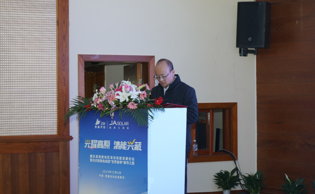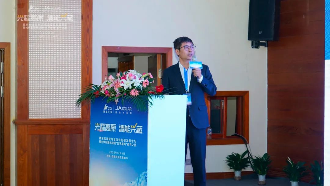 晶澳科技助理总裁张凤海也为大会进行了精彩致辞。他介绍,克服超高海拔、高寒缺氧、群山高耸等恶劣的自然条件,于上个月刚刚并网的昌都市察雅县吉塘200MW+160MWh储能牧光互补复合型光伏项目,采用晶澳科技新一代n型DeepBlue 4.0 Pro组件,产品具备更低衰减、更优高温发电性能、更高双面增益及更好弱光性能,并通过了包括高寒、高紫外、低空气密度、冰雪载荷等系列严苛环境下的可靠性能测试,能够完美适应高海拔地区的环境与气候条件,为电站高效安全稳定地运行提供了有力保障。