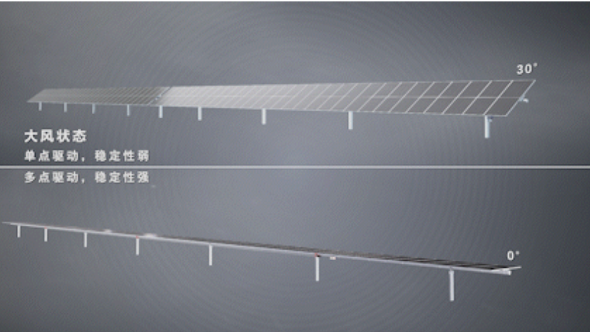 在搭载多点平行驱动系统后,跟踪支架单套系统驱动装置由一变多,大风来临时可实现多点自锁,大风天气适应度高,整体系统在任意角度稳定性均比单点驱动高系统扭转刚性强,因此在各个角度都具备更大的临界风速,可实现200%风稳定性;