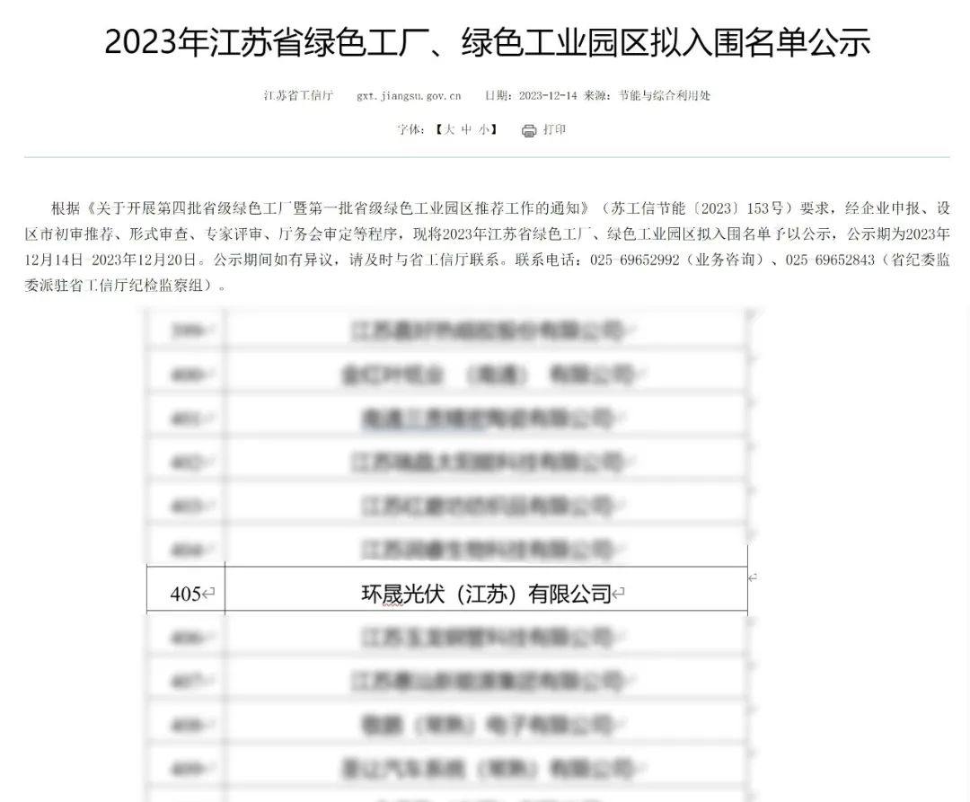 12月14日,江苏省工业和信息化厅公示了2023年江苏省绿色工厂拟入围名单,环晟光伏凭借完善的产品全生命周期绿色管理和先进的工业4.0智能制造水平成功入选榜单。