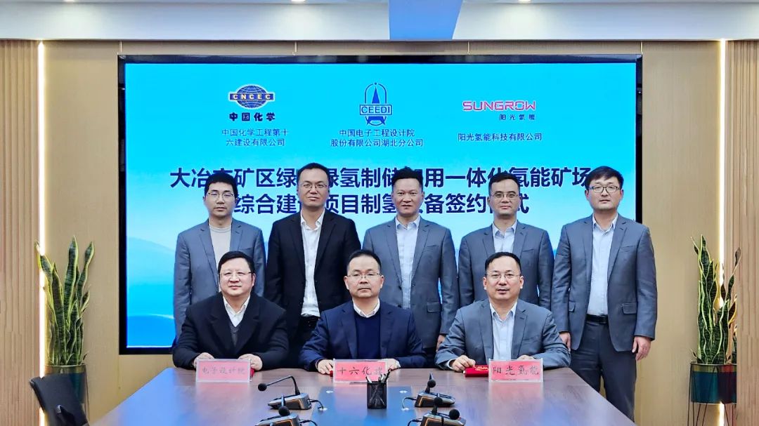 12月26日,国家清洁低碳氢能创新应用工程——大冶市矿区绿电绿氢制储加用一体化氢能矿场综合建设项目“制氢设备”合同正式签约。中国化学工程第十六建设有限公司武汉分公司总经理李静涛,中国电子工程设计院股份有限公司湖北分公司执行院长王共,阳光电源副总裁、阳光氢能董事长彭超才等领导出席。