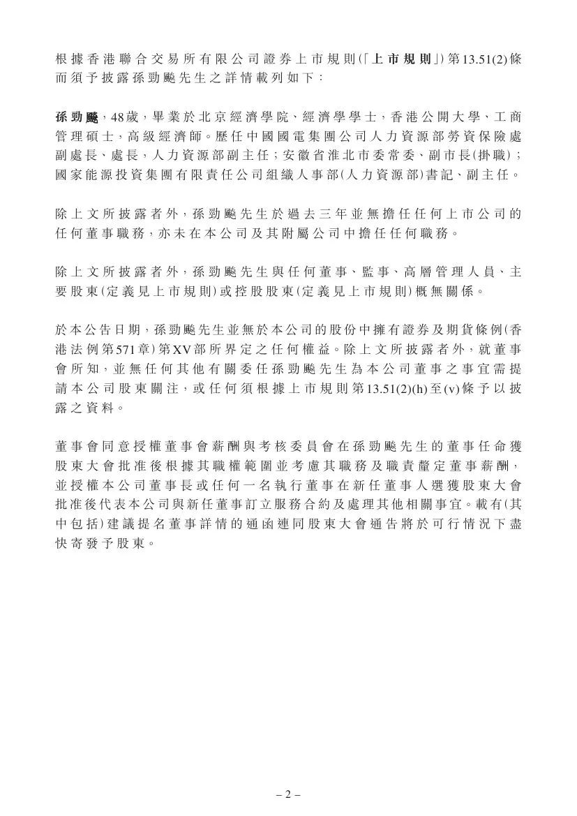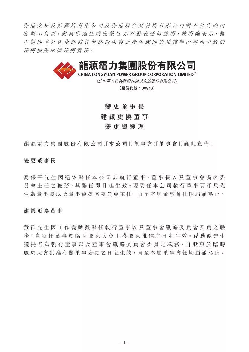 龙源电力近日发布公告,乔保平先生因退休辞任本公司非执行董事、董事长以及董事会提名委员会主任之职务,其辞任即日起生效。现委任本公司执行董事贾彦兵先生为董事长以及董事会提名委员会主任,直至本届董事会任期届满为止。