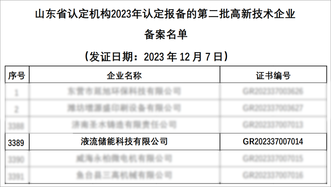 山东省唯一!液流储能公司通过国家高新技术企业认定