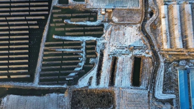 渔光互补,相映成画。鱼塘上方不时有候鸟飞过,与不远处的乡村形成了一幅和谐画面,一块块光伏板“拼出”了绿色乡村的新图景。在鱼塘水面上方架设光伏板阵列,光伏板下方水域可以进行鱼虾养殖,光伏阵列还可以为养鱼提供良好的遮挡作用,走出了一条“水上发电、水下养殖、科学开发、综合利用”的新能源集约化发展和高效水产产业化发展之路,体现人与自然和谐共处,形成 “一种资源、两个产业”集约发展模式。