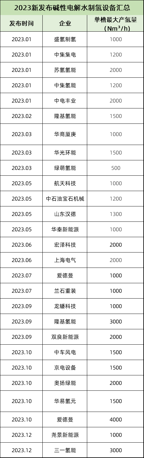 当前,碱性电解槽在我国绿氢项目中仍然占据着绝对主导地位。在碱性电解槽方面,2022年全年共有19家企业发布了新品,而到了2023年全年,发布新品的企业数量更是多达27家。这些新入局的企业中,绝大部分都拥有央国企背景和上市公司背景,在厂房用地、团队搭建、生产和研发费用方面具备雄厚的资金支持。他们的加入为电解槽市场注入了新的活力和竞争力。