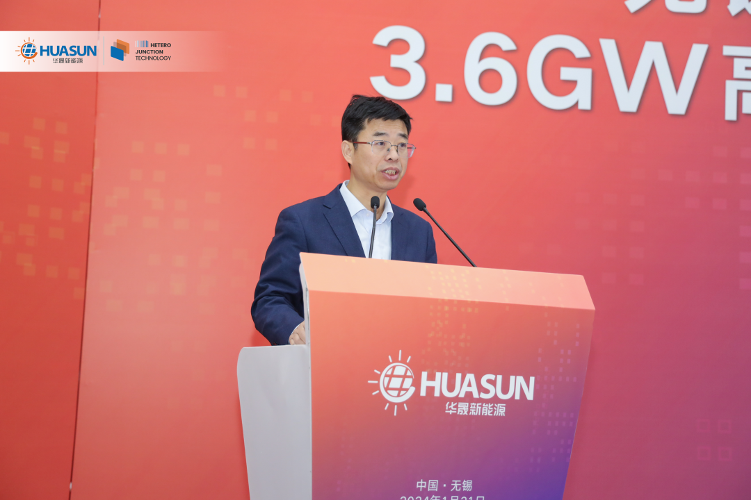 华晟新能源董事长徐晓华首先向各位来宾介绍了无锡基地的项目情况,并表示无锡是中国光伏、半导体的发源地,拥有完整的光伏产业链、稳定的供应链和坚实的人才圈,今日项目的投产,标志着华晟在这片光伏热土中已经生根发芽。无锡政府基于对光伏的深入研究坚定的选择了异质结、选择了华晟,华晟也不负期待交出了首份答卷,完成了“当年拿地、当年开工、当年投产”的庄严承诺。他表示,随着项目的投产及工艺的改进,无锡基地将会稳定量产26%以上效率的电池,有效满足市场对高效异质结电池的旺盛需求。华晟也期望加大在无锡的投资力度,吸引上下游企业积聚锡山,在双碳时代发出“最强无锡声音”。