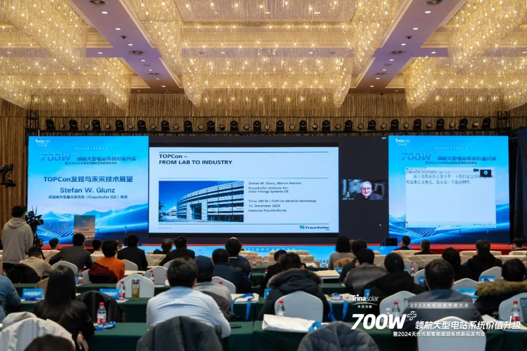 TOPCon具有巨大发展潜力,2023年光伏行业协会年度大会上,Stefan W. Glunz教授在 “700W+领航大型电站系统价值升级暨2024天合光能智能跟踪系统新品发布会”上,对天合TOPCon电池技术现有成果表示祝贺,并认为进入700W+时代,TOPCon电池效率、组件功率还会提升。他认为TOPCon技术还将继续用于下一代产品,未来通过应用钝化接触电池技术和叠层电池技术,TOPCon电池效率可以实现更高的突破。