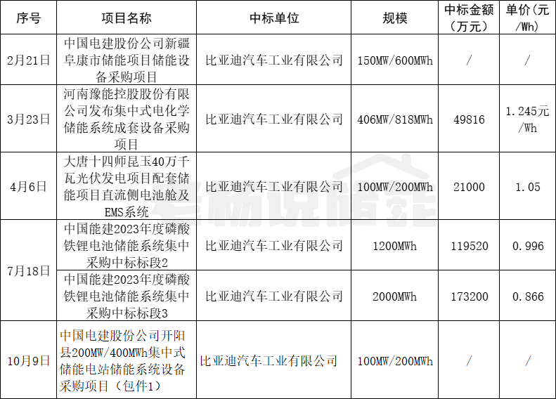 据不完全统计,2023年,比亚迪中标了6项储能项目,其中5个项目的招标单位均为央企,采购规模合计5.018GWh。