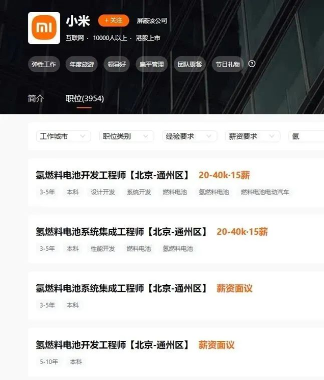 近日,招聘网站上出现了多个小米招聘氢燃料电池开发工程师、氢燃料电池系统集成工程师等多个氢燃料电池岗位信息。