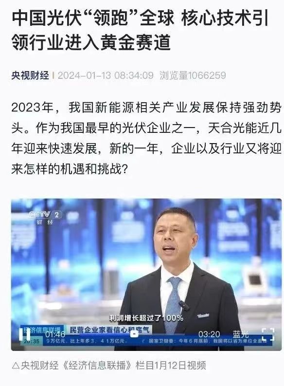 1月16日,央视财经再度刊文,以民营企业家的视角展望2024年,以坚定的信心和深厚的底气,为中国经济高质量发展注入更强劲的动力。报道以天合光能为例,不只是在高原、沙漠和海上处处可见光伏电池板的身影,随着核心技术的突破,中国的光伏产品,也在海外开拓了更大的市场。高纪凡在专访中表示:“2024年,我们也有信心,持续地创新驱动,让中国光伏全产业链,持续地走在全球前列,推动行业的高质量增长。”