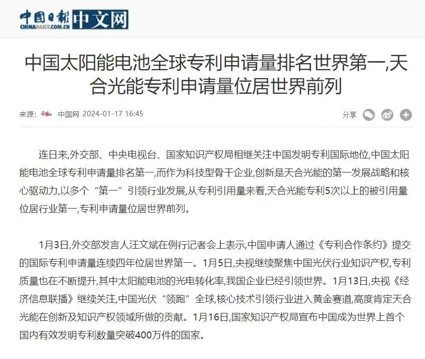 1月17日,中国日报发表文章《中国太阳能电池全球专利申请量排名世界第一,天合光能专利申请量位居世界前列》。报道指出,世界光伏专利看中国,中国光伏专利看江苏,江苏光伏专利看天合。天合光能专利申请量位居世界前列,发明专利授权量位居江苏第一,也是为数不多的能够同时在光伏和储能领域专利申请量均表现亮眼的企业。