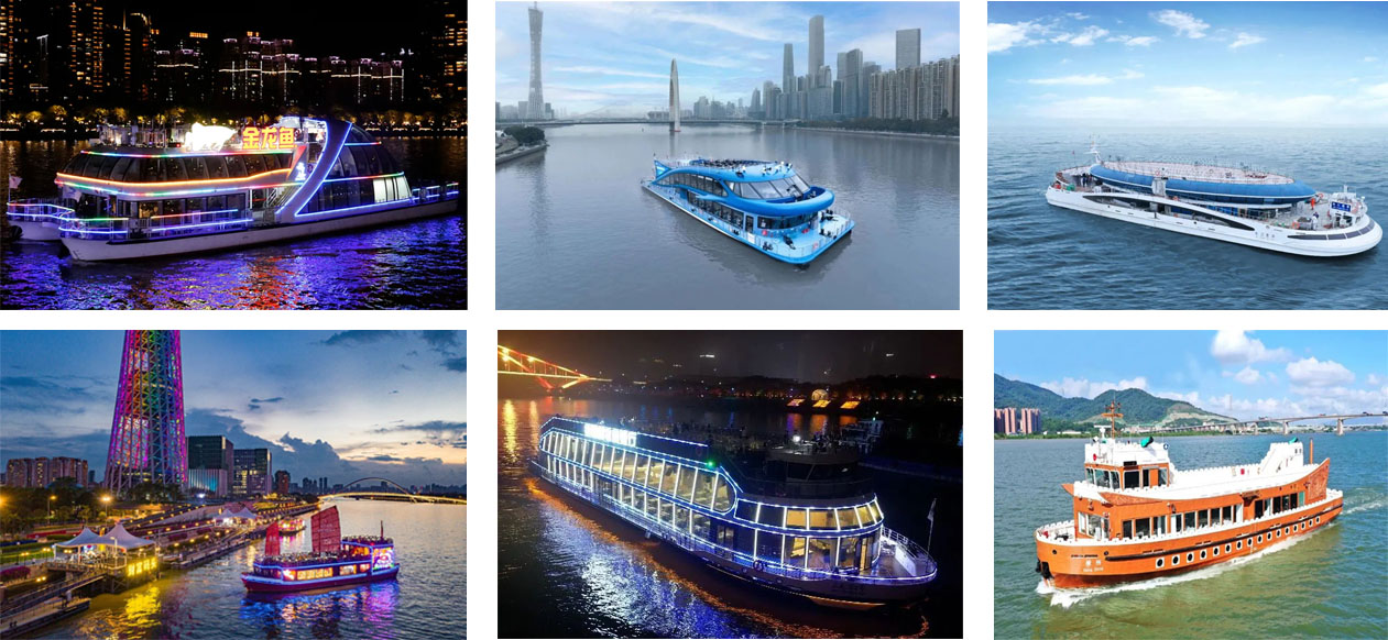 (从左到右,从上到下依次为:280客位金龙鱼号、402客位蓝海豚23号、500客位珠江翡翠号、160客位珠江公主号、400客位三龙湾蓝海豚以及180客位虎门渡船)