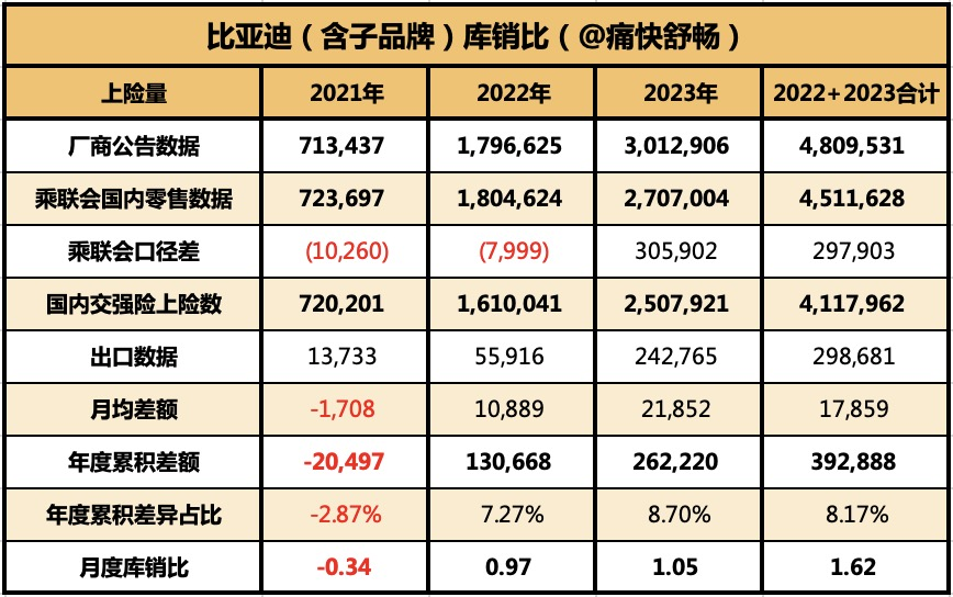 那么真实的库存也就是不到1.5个月的零售销量,36-39万的绝对库存看起来有点惊人,但如果放到比亚迪一年300万辆的体量上来看也并非夸张。