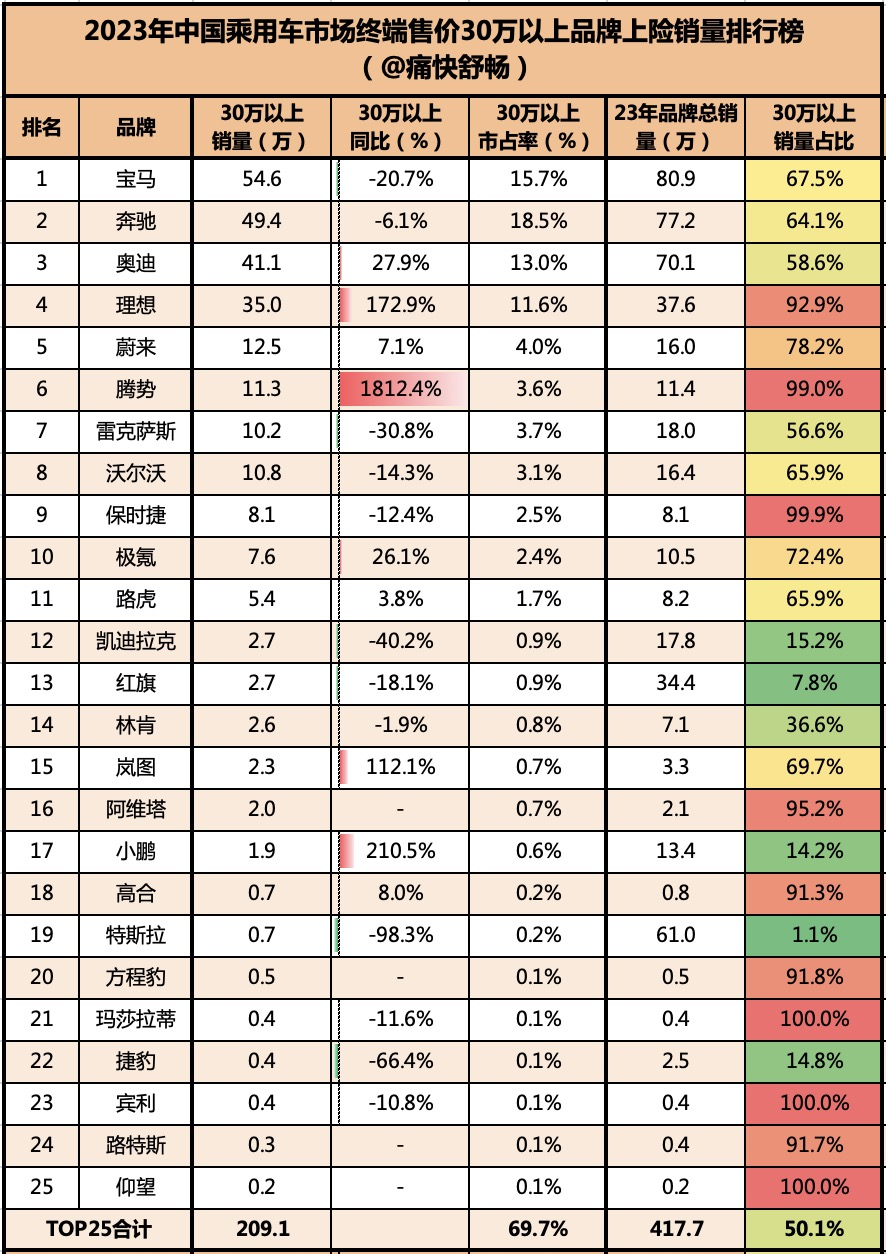 如果以30万元为一条基准线,我们统计了豪华品牌30万+售价的销量占比,其实会发现:腾势作为自主新豪华的代表品牌已经成功了。