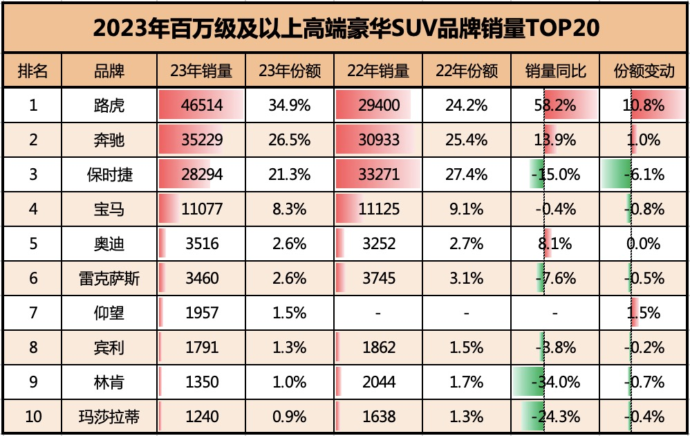 虽然由于云辇P系统的复杂性,让仰望U8的交付有所延迟。但依旧无法阻挡高端消费者的强烈的需求。2023年仰望U8仅仅交付了不到2个月时间,但百万元的售价、1957辆的上险成绩,不仅仅打破了自主品牌售价百万的天花板,即便是放在2023年百万级以上高端豪华SUV的销量榜上,仰望品牌也能够排名第七。并且,按照这个趋势在2024年仰望大概率将有机会冲击榜单第四,或者第三的地位,创造自主豪华品牌的新纪录。