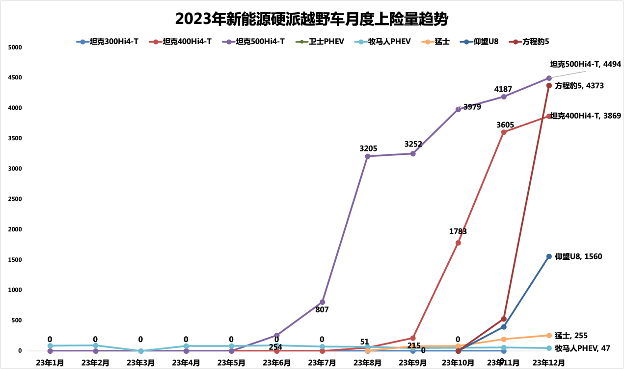 在2023年方程豹完整交付的第一个月,上险销量来来到4,373辆,成为带大梁的硬派SUV销量榜的亚军。而这还是在云辇版本尚未交付的前提下达成的,要知道云辇版的订单占到方程豹豹5全部订单的60%。